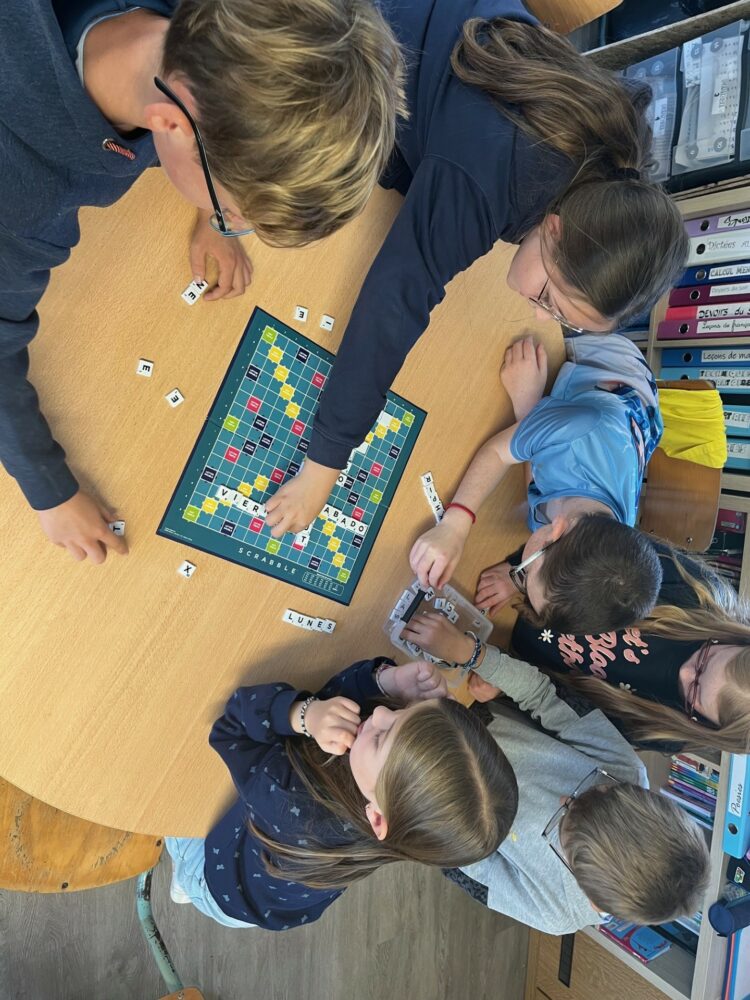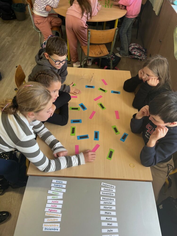 Les élèves de CE2-CM participent à quatre ateliers ludiques pour apprendre les jours de la semaine et les mois de l’année en français, anglais et espagnol. Ils découvrent un Scrabble multilingue, un Mémory, un jeu de mots mêlés et un jeu de recomposition, qui stimulent mémoire, vocabulaire et plaisir d’apprendre.