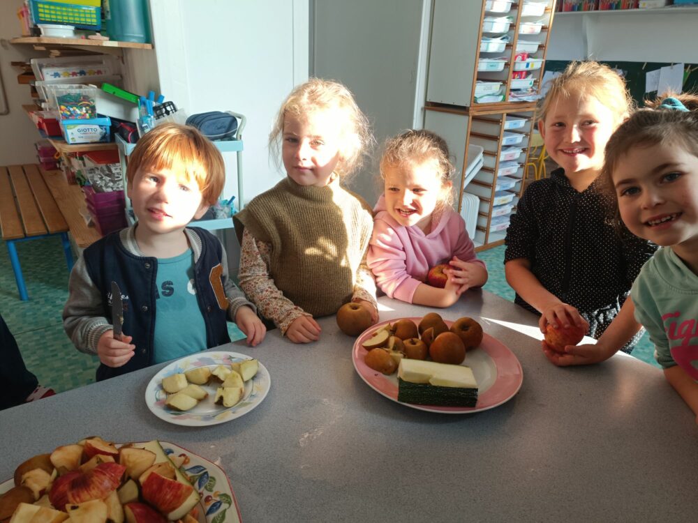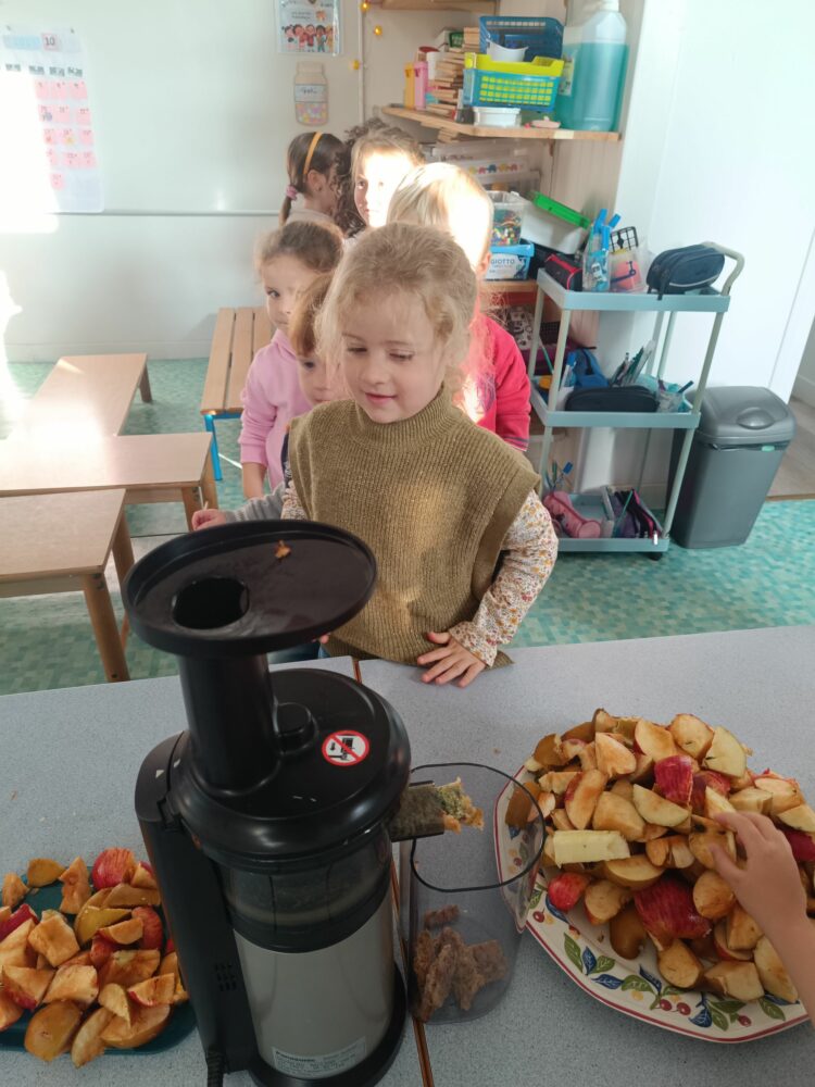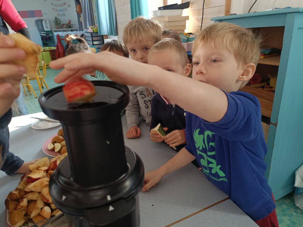 - Jour 1 : Nous avons transformé les pommes ramassées lors de notre matinée “école dehors” en un délicieux jus pommes–menthe–courgette.
