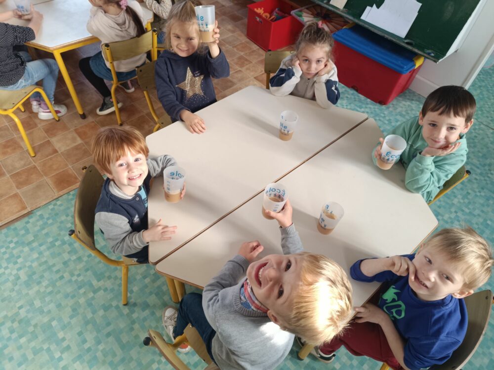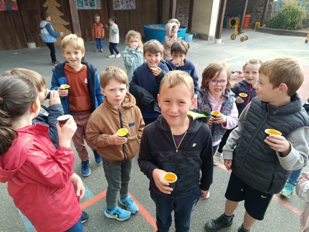 La semaine dernière, nous avons découvert le goût à travers les boissons, en utilisant des produits de saison et parfois même nos propres récoltes ! Nous avons cuisiné en classe, puis nous avons fait goûté aux grands nos recettes ! Ils ont beaucoup aimé et nous étions très fiers de leur faire découvrir nos préparations.